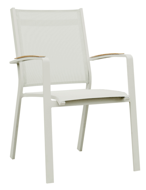 Fauteuil repas jardin alu blanc sling gris accoudoirs bois