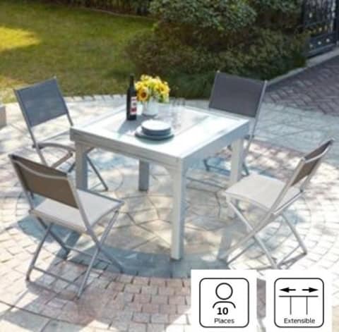 Table repas extensible extérieur aluminium blanc plateau verre gris