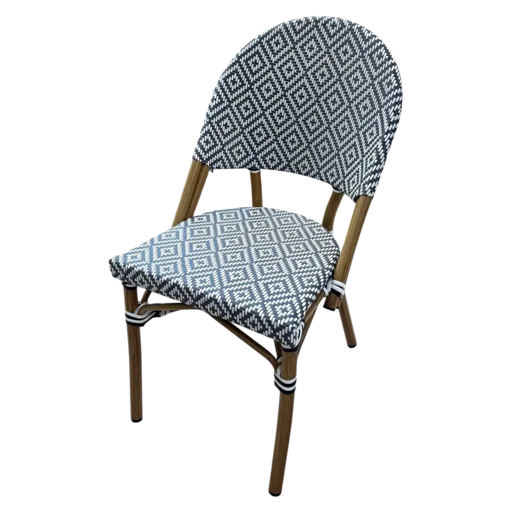 Son dossier arrondi et son assise tressée à motif géométrique gris créent un style bistro contemporain qui s’intègre facilement sur une terrasse ou un balcon.