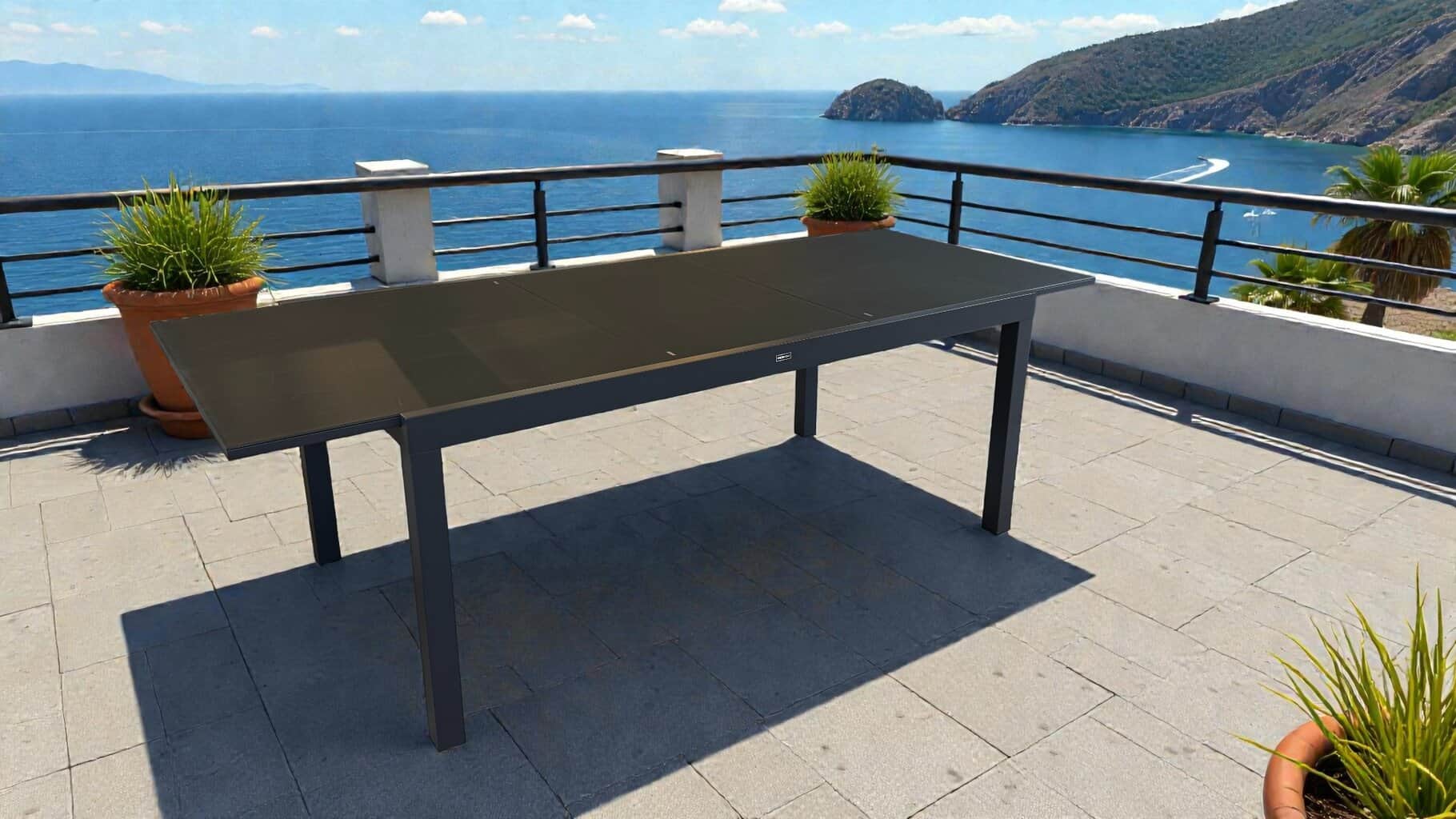 Entièrement conçue en aluminium, elle offre une structure légère mais robuste, résistante à la corrosion et simple à entretenir, avec un plateau de 180 cm pouvant atteindre 240 cm.