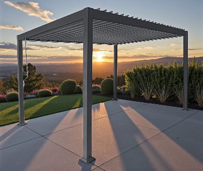Le toit à lames orientables permet de moduler l’ombre et la luminosité selon le moment de la journée, et l’éclairage LED solaire intégré prolonge l’utilisation de la pergola en soirée.